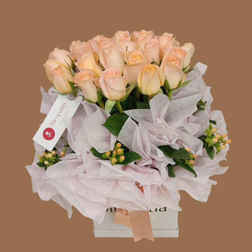Box de 25 Rosas melones en fina presentación 48 cm de alto