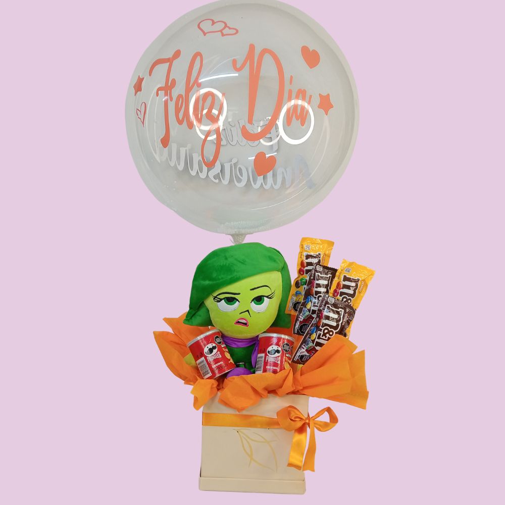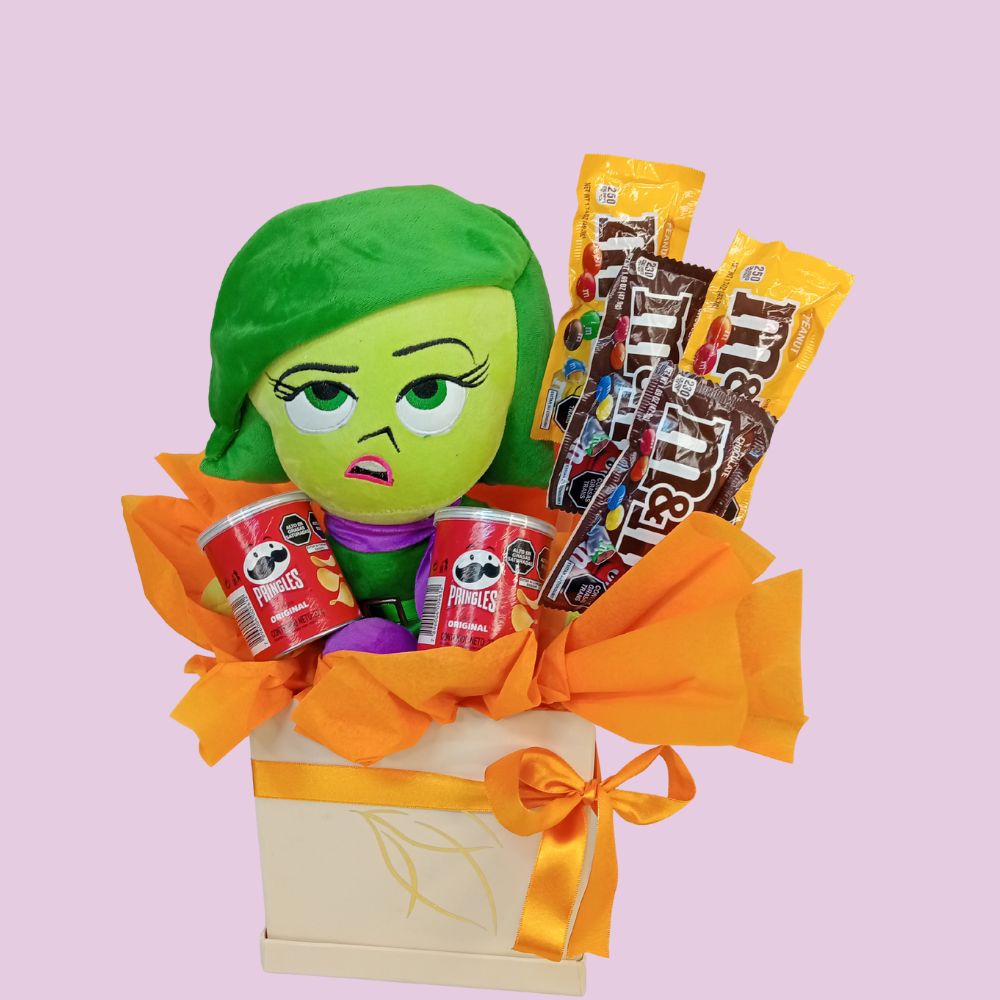Desagrado con amor, Peluche de 25 cm, Caramelos M & M y dos latas chicas de papas Pringles en linda presentación