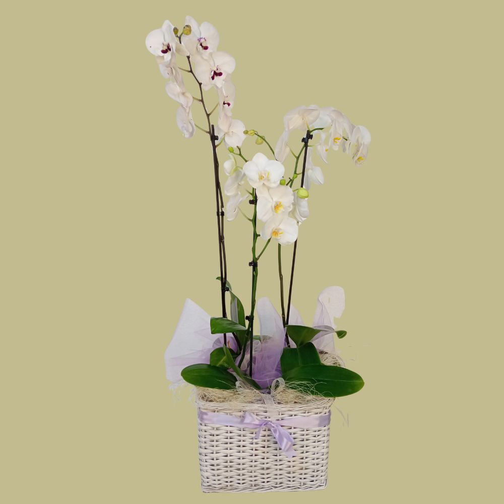 Cesta de 3 plantas de Orquídeas blancas en fina presentación, consulte disponibilidad y solicítelo con anticipación.
