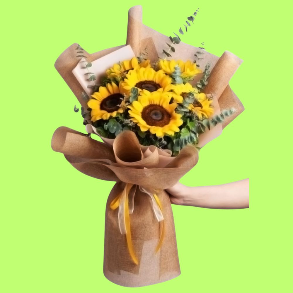 Ramo de 6 Girasoles con follaje fino, silverdollar, decorado con papel coreano decorativo.